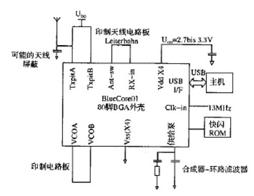 圖2單芯片藍(lán)牙方案“Bluecorco1”,只需少量外接元件,尤其是沒有電感、微調(diào)電容器、共振器或?yàn)V波器