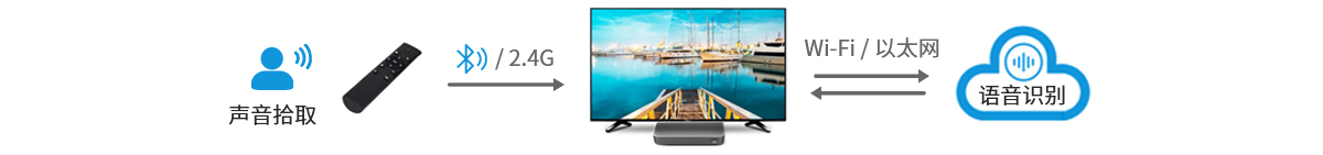 對于智能語音遙控器,用戶按下語音識別鍵后,遙控器告知電視啟動語音識別功能,同時拾取用戶語音,將音頻數(shù)據(jù)發(fā)送至電視,電視根據(jù)云端識別結果執(zhí)行節(jié)目搜索或打開相關應用。