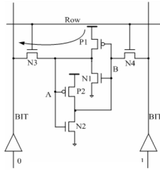 在六管單元的寫操作中,外部電路驅(qū)動兩個互補的信號到位線BIT 和BIT_上,字線驅(qū)動器驅(qū)動字線ROW 到高電平,位線信號經(jīng)兩個傳輸管寫入存儲節(jié)點。如圖3.6 所示的正是向存有“1”的單元寫“0”的情況,也就是把A 點的電平由VDD 下拉至GND。