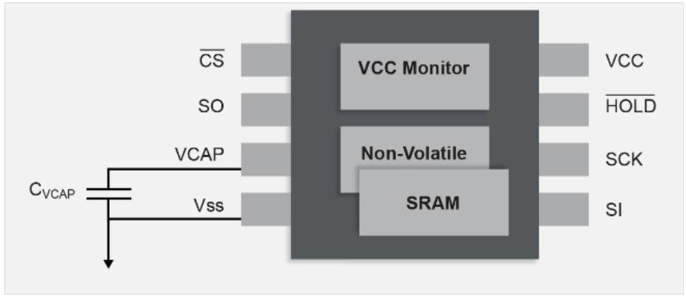 串行SRAM,在器件內(nèi)部的每個單元中都包含非易失性晶體管。與NVSRAM不同,它不需要外部電池。它使用一個小的外部電容器來提供當系統(tǒng)斷電時將SRAM的內(nèi)容移動到非易失性單元所需的能量,這是通過IC監(jiān)視公共集電極上的電壓并自動處理SRAM和SRAM之間的數(shù)據(jù)移動來實現(xiàn)的。必要時使用非易失性存儲器。