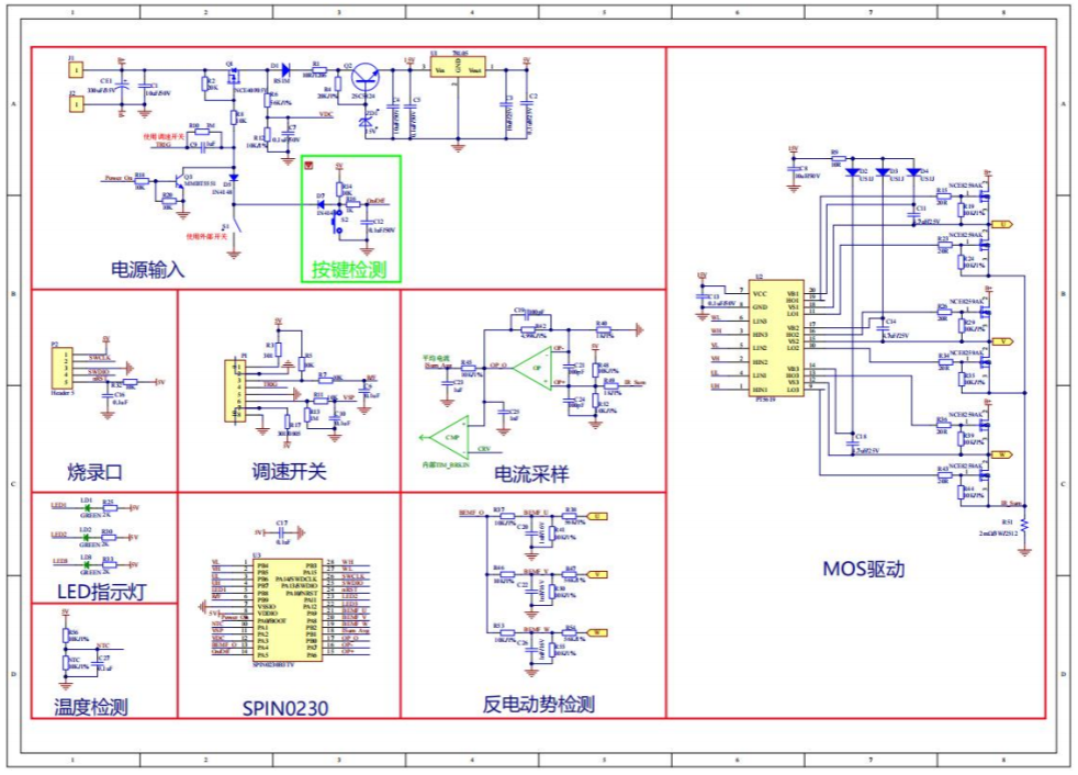 -通過反電動勢分壓電路檢測過零點信號得到位置信息,對應(yīng)六種不同的逆變器MOS管驅(qū)動順序,實現(xiàn)BLDC電機的六步換相。