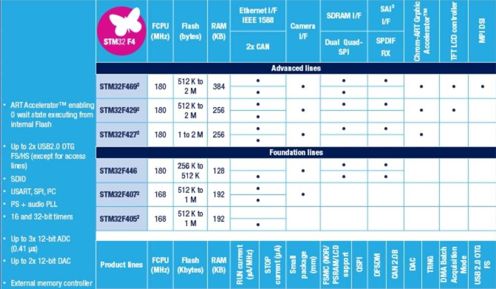 STM32F413/F423–擴展了STM32F412的功能,具有更高的RAM和閃存密度以及增強的外設集,其中包括10個UART,3個CAN,SAI接口,一個低功耗定時器,2個DAC,2個DFSDM和最多6個濾波器。STM32F423包含AES加密。