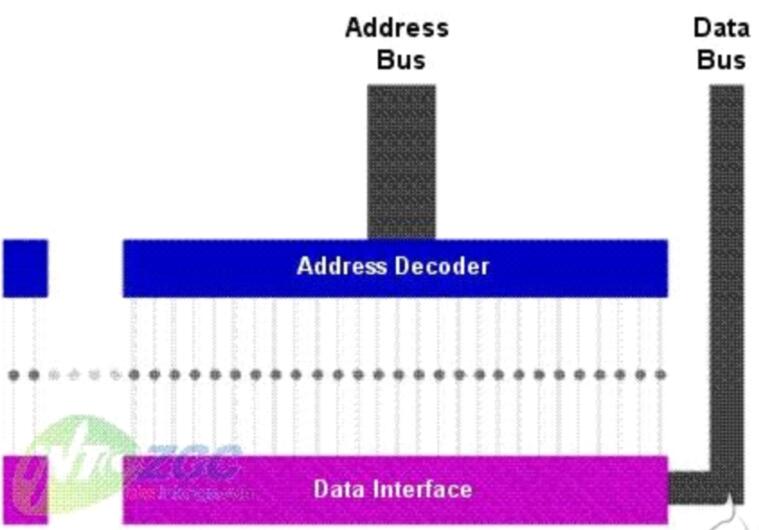 上圖中的小圓點(diǎn)代表RAM中的存儲(chǔ)空間,每一個(gè)都有一個(gè)唯一的地址線同它相連。當(dāng)?shù)刂方獯a器接收到地址總線傳送來(lái)的地址數(shù)據(jù)之后,它會(huì)根據(jù)這個(gè)數(shù)據(jù)定位中央處理器想要調(diào)用的數(shù)據(jù)所在的位置,然后數(shù)據(jù)總線就會(huì)把其中的數(shù)據(jù)傳送到中央處理器。