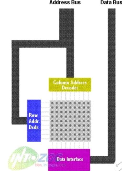如果RAM對(duì)于CPU來(lái)說(shuō)僅僅是一條“線”的話,還不能體現(xiàn)實(shí)際的運(yùn)行情況。因?yàn)槿绻麑?shí)際情況真的是如此的話,在實(shí)際制造芯片的時(shí)候,會(huì)有很多實(shí)際的困難,特別是在需要設(shè)計(jì)大容量的RAM的時(shí)候。所以一種更好的能夠降低成本的方法是讓存儲(chǔ)信息的“空格”排列為很多行--每個(gè)“空格”對(duì)應(yīng)一個(gè)bit存儲(chǔ)的位置。如果要存儲(chǔ)1024bits(2^10)數(shù)據(jù),那么你只要使用32x32(2^5*2^5=2^10)的矩陣就能夠達(dá)到這個(gè)目的了。很明顯一個(gè)32x32的矩陣比一個(gè)1024bit的行設(shè)備更緊湊,實(shí)現(xiàn)起來(lái)也更加容易。請(qǐng)看圖2.