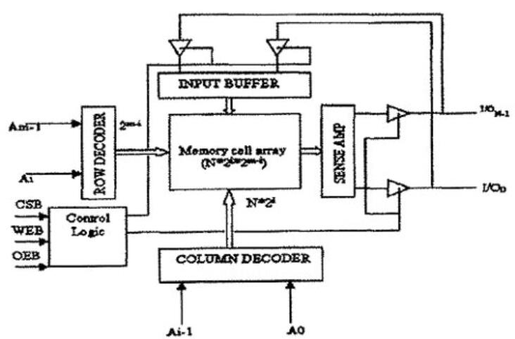 由上圖看出SRAM一般由五大部分組成,即存儲單元陣列、地址譯碼器(包括行譯碼器和列譯碼器)、靈敏放火器、控制電路和緩沖/驅動電路。在圖中A0-Am-1為地址輸入端,CSB. WEB和OEB為控制端,控制讀寫操作,為低電平有效1100-11ON-1為數據輸入輸出端。存儲陣列中的每個存儲單元都與其它單元在行和列上共享電學連接,其中水平方向的連線稱為“字線”,而垂直方向的數據流入和流出存儲單元的連線稱為“位線”。