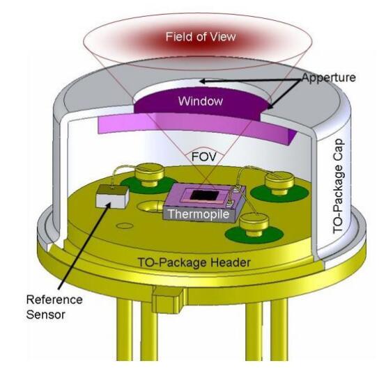 一般采用金屬外殼封裝,物料的紅外射線經(jīng)過(guò)表面的濾光片進(jìn)入到里面的熱電堆電偶上,再經(jīng)過(guò)信號(hào)感應(yīng)轉(zhuǎn)換成電信號(hào)。