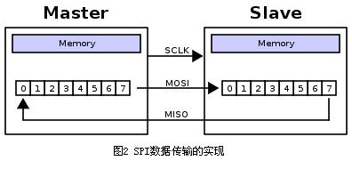 這是通過移位寄存器來實現的。如圖2所示,主機和從機各有一個移位寄存器,且二者連接成環。隨著時鐘脈沖,數據按照從高位到低位的方式依次移出主機寄存器和從機寄存器,并且依次移入從機寄存器和主機寄存器。當寄存器中的內容全部移出時,相當于完成了兩個寄存器內容的交換。