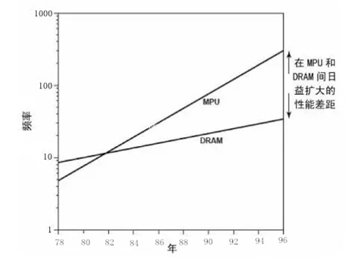 芯片集成度的不斷提升,給分立存儲器帶來了兩大挑戰:首先:集成度和工藝開始允許片內集成更多的存儲器;其次,存儲器的速度發展遠遠趕不上于MPU的速度,MPU速度以每年60%在成長,而存儲器只有10%。二者速度之間增長的差異巨大,如下圖所示。