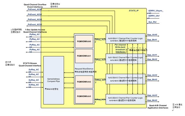 圖2中的STATS_IP架構(gòu)模塊圖標(biāo)出了三個子部件:每條通道的同地址比較管道(SACOMP)區(qū)塊、請求-復(fù)用-解復(fù)用(REQ_MXDMX_CHn)區(qū)塊以及每條QDR IV應(yīng)用通道1個的4個A-B通道配對計數(shù)器邏輯(ABCH_CTRL_CHn)區(qū)塊實例。