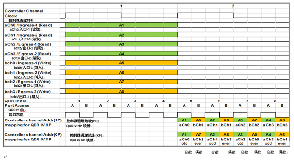 統(tǒng)計流四通道和一秒(處理器)更新四通道接口作為應(yīng)用通道。QDR IV控制器采用帶有為QDR IV端口A和端口B定義的專用四通道端口界面的4:1/1:4通道復(fù)用/解復(fù)用功能。QDR-IV控制器以固定順序?qū)νǖ肋M行復(fù)用和解復(fù)用,應(yīng)用端和以4X時鐘頻率運行的QDR IV設(shè)備端之間的順序為ch0、ch1、ch2和ch3。圖3為所假設(shè)的QDR-IV控制器順序和建議的QDR IV HP統(tǒng)計計數(shù)器解決方案和QDR IV XP統(tǒng)計計數(shù)器解決方案應(yīng)用通道